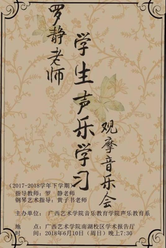 【音乐会预告】音乐教育学院罗静老师学生声乐学习观摩音乐会 来源: 作者:音乐教育学院 发布时间:2018-06-04 14:47:43 浏览次数: 次 【字体:小 大】 音乐教育学院罗静老师学生声乐学习观摩音乐会即将于2018年6月10日(周日)晚上7:30在广西艺术学院南湖校区学术报告厅精彩上演,欢迎广大师生前往观看指导! 节目单 审核:聂玫 分享到: 【打印正文】
