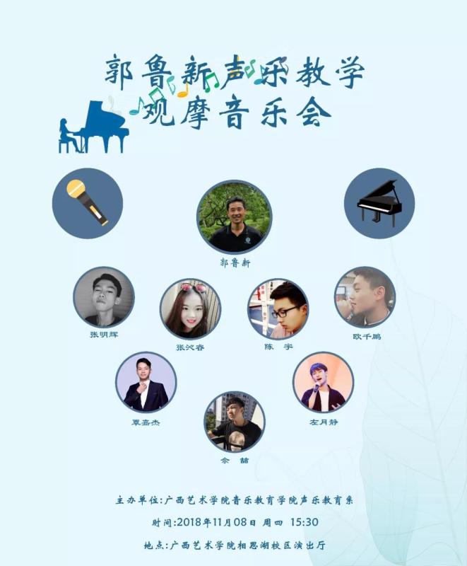 音乐教育学院郭鲁新老师声乐教学观摩音乐会即将于2018年11月8日周四15:30在广西艺术学院相思湖校区演出厅精彩上演,欢迎广大师生前往观看指导!