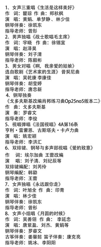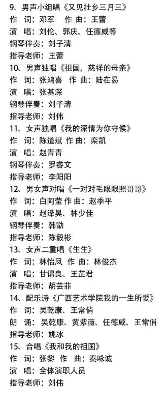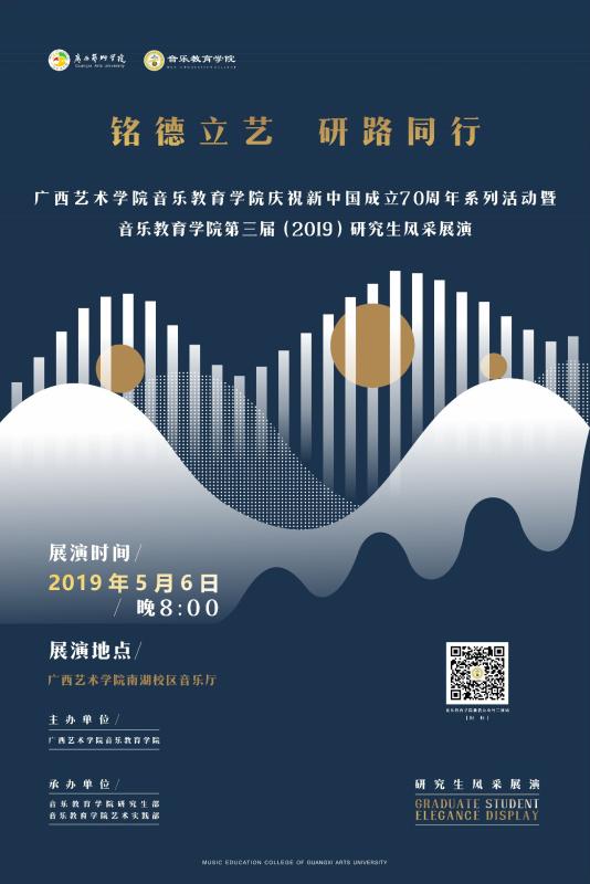 【重要展演预告】音乐教育学院庆祝新中国成立70周年系列活动暨“铭德立艺·研路同行”第三届(2019)研究生风采展演 来源: 作者:音乐教育学院 发布时间:2019-05-03 13:13:45 浏览次数: 次 【字体:小 大】 兹定于2019年5月6日(周一)晚8:00在广西艺术学院南湖校区音乐厅举办音乐教育学院庆祝新中国成立70周年系列活动暨“铭德立艺·研路同行”——音乐教育学院第三届(2019)研究生风采展演。 敬请莅临指导! 节目单 分享到: 【打印正文】