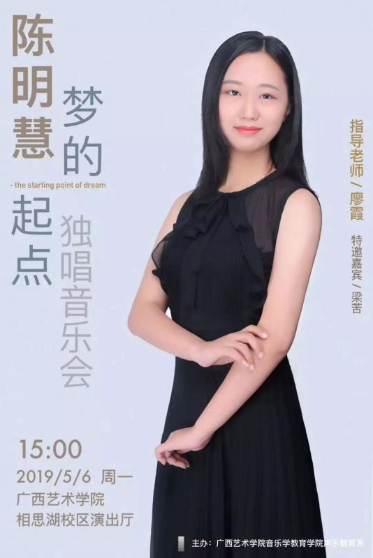 兹定于2019年 5月6日(周一)15:00,在广西艺术学院相思湖校区演出厅举办“梦的起点”——陈明慧独唱音乐会。