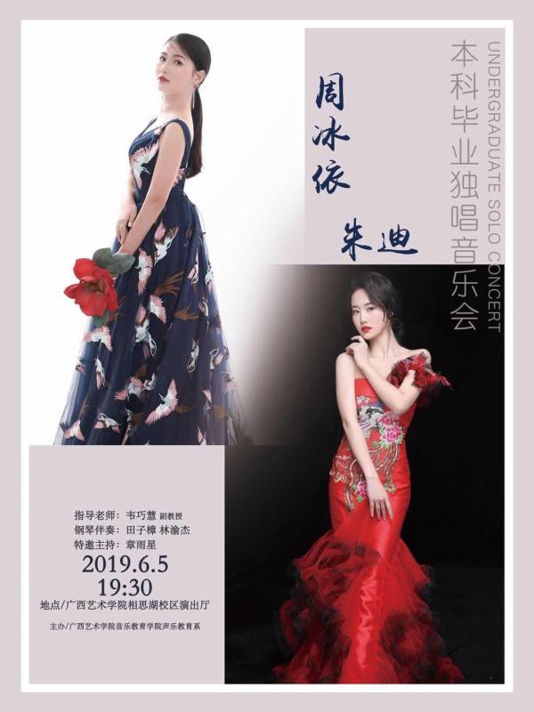 兹定于2019年6月5日(周三)晚7:30在广西艺术学院相思湖校区演出厅举办音乐教育学院周冰依、朱迪本科毕业独唱音乐会。