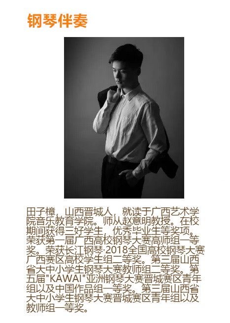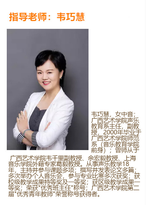 民族女高音,浙江金华人。2015年考入广西艺术学院音乐教育学院音乐学(音乐教育)专业,主修声乐,师从于韦巧慧副教授。