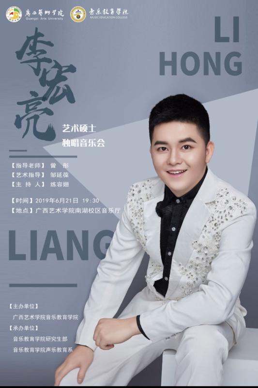 李宏亮,广西来宾人 ,民族男高音 ,2010年在来宾二中师从启蒙老师莫彩虹指导下,2013年以优异成绩考入广西艺术学院,2017毕业于广西艺术学院音乐教育学院,师从曾彤教授,同年考上广西艺术学院音乐教育学院硕士研究生,继续跟随曾彤教授进行学习。